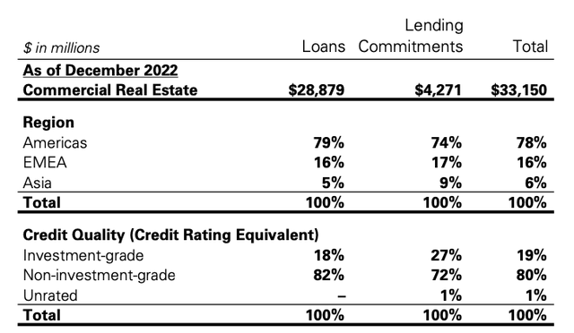 The problem is that mainstream financial media fail to mention that there are a lot of large U.S. banks that have serious issues in the CRE space. Almost a year ago, we published an article titled Is Your Bank Safe? A Look At Goldman Sachs on Goldman Sachs (GS), saying that its CRE book looks extremely risky as 83% of the group's loans were granted to non-investment-grade borrowers, which are often called "junk" borrowers.
