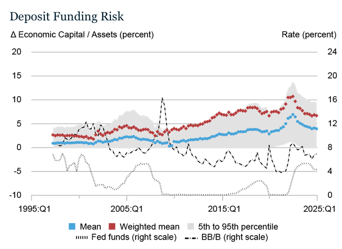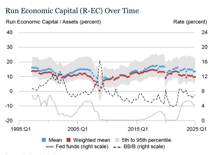 Note: The chart shows economic capital scaled by assets from 1997:Q2 to 2025:Q1 for all commercial banks with assets exceeding $50 million, excluding trust banks. The blue diamonds are average values, the red diamonds are asset-weighted averages, and the grey shading depicts the 5th to 95th percentile range. The dashed line is the average yield on B- and BB-rated corporate bonds.